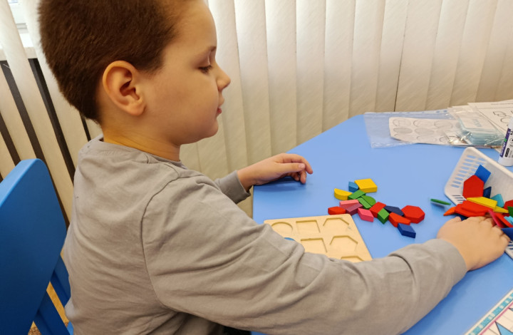 Ребята работают над графомоторными навыками и математическими представлениями. "Графомоторные навыки: Продолжена планомерная работа по укреплению руки и развитию координации. Формируется соблюдение границ при обводке, штриховке. Математические представления: Закрепляем навыки счета (количественный и порядковый). Узнавание, наименование и сортировка геометрических фигур. Все задания и занятия проводятся индивидуально. Каждый ребенок двигается по своей индивидуальной траектории", - рассказывает дефектолог Александра Болдырева.