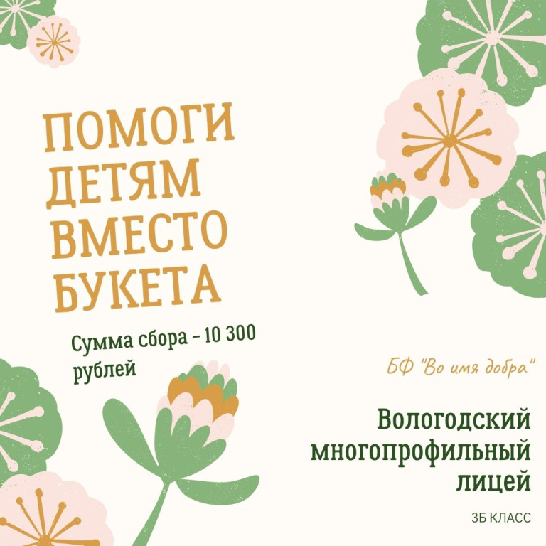 Дети и педагоги провели уже ставшую традицией акцию «Помоги детям вместо букета». Напомним: ребята 3Б класса, подарили один букет учителю, а сумму, равную стоимости остальных цветов, решили отдать тем, кому она нужнее. Сбор 10 300 рублей переведен в БФ «Во имя добра».