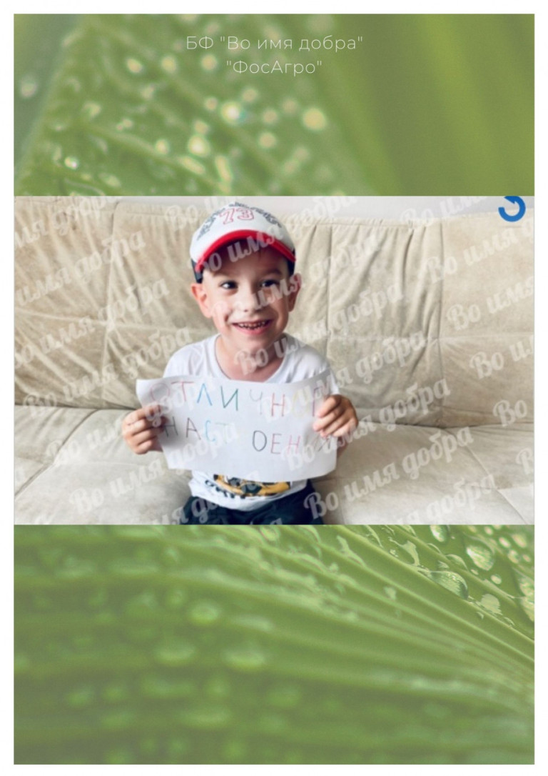 Благотворительная помощь оказана на сумму 100 000 руб. Благодарим компанию "ФосАгро" за поддержку детей с ОВЗ, Демьяну желаем здоровья и успешной реабилитации, а его родителям, педагогам и медикам - терпения и оптимизма!