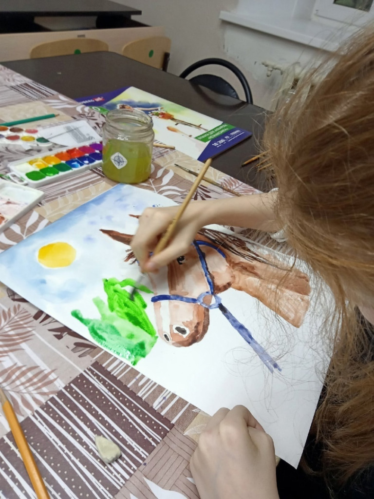"Хочется немного рассказать о Геле. Мы познакомились с ней на проекте "Доктор Лошадь", когда девочка пришла заниматься оздоровительной верховой ездой. Скромный, тихий, не очень уверенный в себе ребенок. Но время шло, Геля закончив проект, пришла заниматься за его рамками, участвовала в городских и областных соревнованиях по конному спорту для детей ОВЗ, имеет грамоты и медали за 1,2 и 3 места и мы с мамой Гели думаем что произошло маленькое чудо - ребенок не только поверил в себя и свои силы, у девочки повысилась самооценка, появилась уверенность в себе и она стала РИСОВАТЬ!!! Все эмоции которые переполняли ребенка на тренировках стали воплощаться на бумаге, дальше больше. Геля рисует не только лошадей, но и других животных, чувствует палитру красок (у девочки диагноз ДЦП). Она рисует и себя на занятии верхом на лошади и свою мечту - преодоление препятствия, любимых китайских драконов и многое другое. В этот год Геля стала еще ходить на занятия по рисованию, где ей тоже очень нравиться. Летом прошлого года совместно с Благотворительным фондом "Во имя добра" была первая онлайн выставка Гелиных работ. Хочется сказать большое спасибо БФ "Во имя добра" и компании ФосАгро за возможность участвовать детям в проекте "Доктор Лошадь" благодаря которому ребята не только занимаются оздоровительной верховой ездой, но и раскрывают в себе новые таланты!"