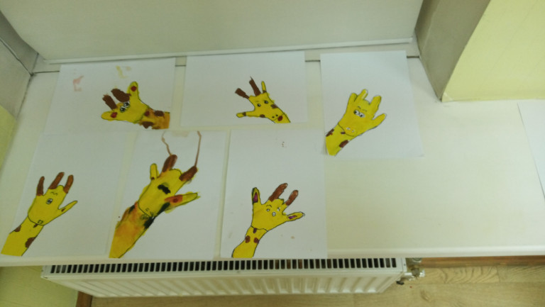 Их ведёт художница с синдромом Дауна Евгения Дубровская. Она рассказывает: "Мы учились рисовать черепашку и жирафа из рук. Всем было интересно! Обводили руки и рисовали разных животных. Картинки получились разные, поскольку руки у всех разные. Дети большие молодцы, даже помогали друг другу".